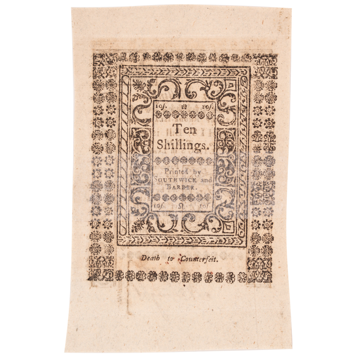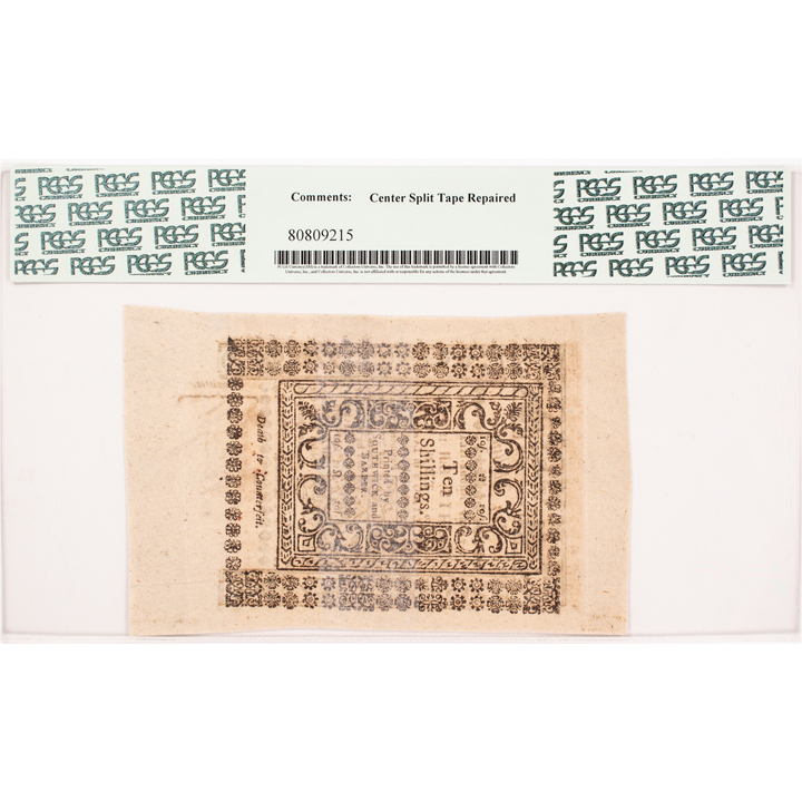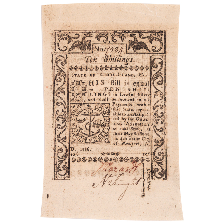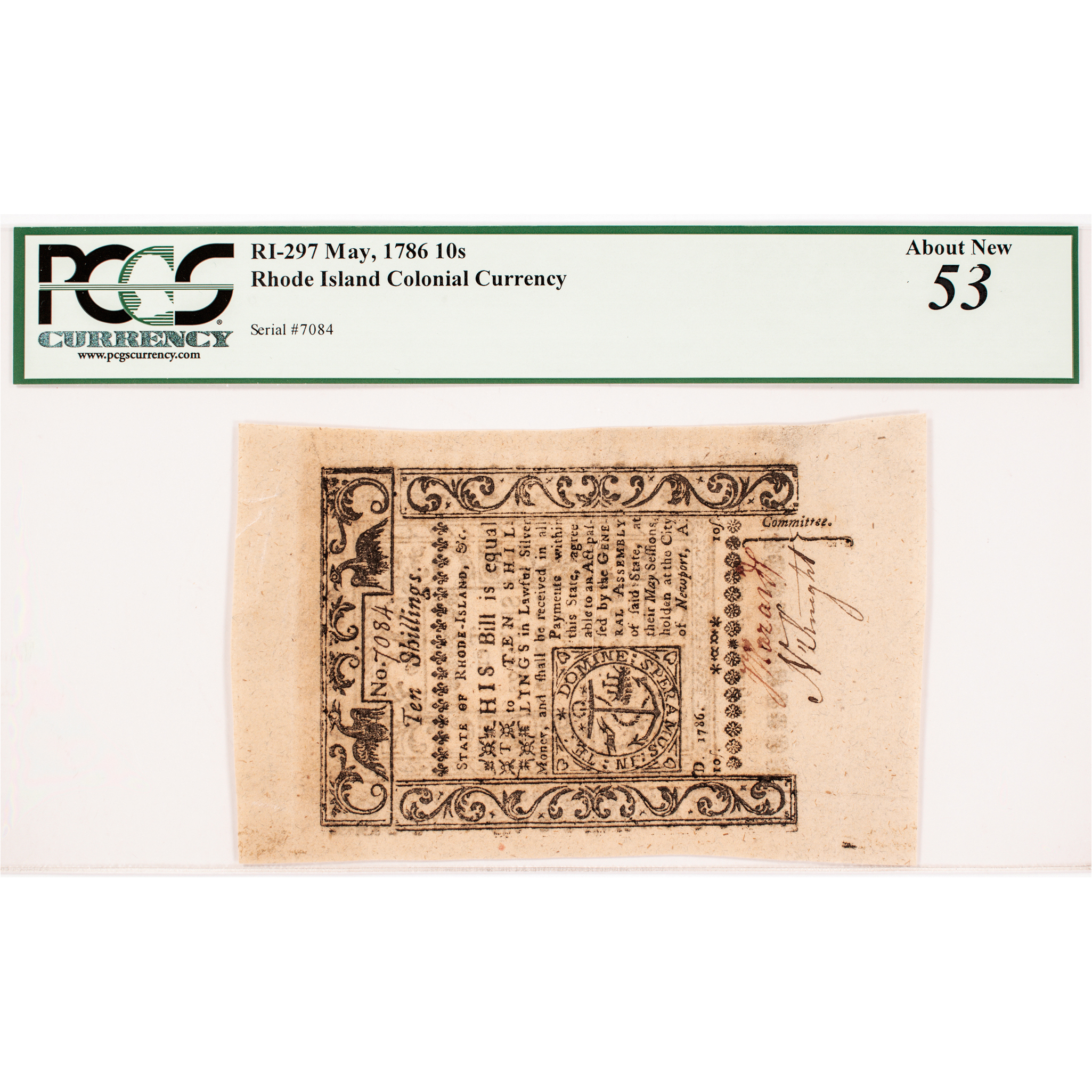 May 1786, State of Rhode Island Colonial Currency, Ten Shillings, Jumbo margins, PCGS graded About New-53.