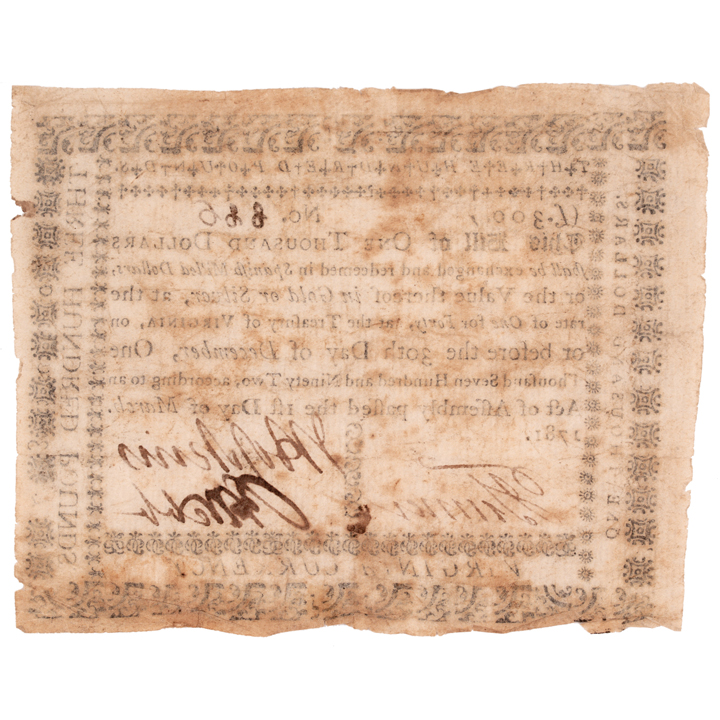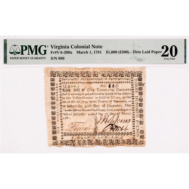 March 1, 1781 Virginia $1,000 PMG Graded Very Fine-20