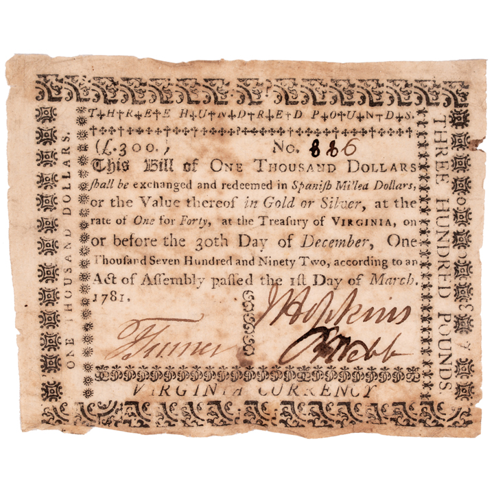 March 1, 1781, Virginia Colonial Currency, One Thousand Dollars of Three Hundred Pounds (the Highest Denomination), PMG graded Very Fine-20. Fr. VA-209a. Another testament to the inflationary pressures of using paper money during the Revolutionary War period. This evenly circulated Uniface note represents the highest denomination issued for this emission and is one of only a small handful of known examples. The blank reverse is clean and free of notations. The holder comments stained which is too harsh as the nthin paper note is evenly toned, not stained, as shown. |