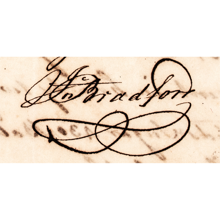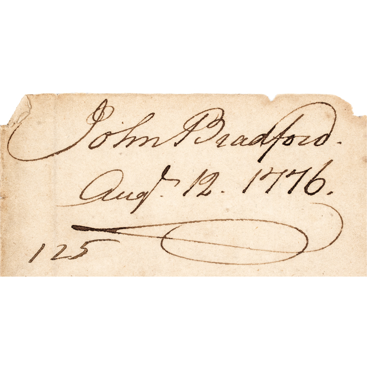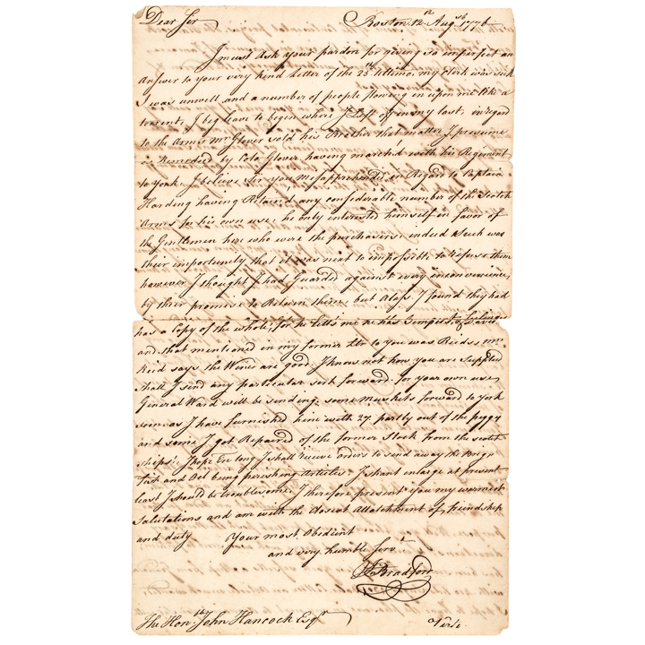 From John Hancock’s Personal Retained Files Ex: The Hancock-Chase Collection, with Docket Handwritten by John Hancock (JOHN HANCOCK) (1737-1793), Docket Signed by his Hand, while serving as President of the Continental Congress from May 24, 1775 to October 30, 1777, (later from November 23, 1785, to June 5, 1786); His bold signature on the Declaration of Independence has become an iconic symbol of American Independence and synonymous with the word “Signature”. JOHN BRADFORD (1729-1803). American naval officer and Patriot who served as the Acting Naval Prize Agent at Boston during the American Revolutionary War responsible for overseeing the disposition of Prizes and their cargoes Captured by American naval vessels in the waters around Boston, as the capture of enemy vessels was an important source of revenue and supplies for the American Patriot cause. August 12, 1776-Dated Revolutionary War Period, extensive Autograph Letter Signed, “J(ohn) Bradford” to John Hancock, two pages (written on three sides with Docket), both pages having a large ornate “L. V. GERREVINK” watermark within the laid period paper, measuring 12.75” x 7.75”, Boston, Fine. This attractive Naval Content Letter also mentions General Washington and names some early Privateer ships. It is written in rich brown ink and ends with John Bradford’s bold signature and flourish below. The first page sheet is cleanly separated along the horizontal centerfold, yet is complete, well written, being easily readable. This historic ALS appears to be a potential easy archival repair if desired, having only some short fold edge splits from handling as shown. The bold Handwritten Docket on the 3rd page panel is written by the then acting Continental Congress President, John Hancock’s own hand, reading: “John Bradford / Augt 12. 1776.” (not signed by Hancock yet written by him with Hancock’s famous flourish below). An important content letter reporting on current Revolutionary War Naval activity via private communication. Here, General George Washington’s appointed Naval Prize Agent at Boston, John Bradford, writes to then serving President of the Continental Congress, John Hancock, reporting on the activities of Six of Washington’s duly appointed Privateers. In doing so, Bradford is forced to relate that Privateer Captains Glover and Harding chose to sell badly needed captured British muskets to private individuals, instead of delivering them for military use to the American Continental Army! In reading this letter of correspondence, one can almost see the writer, John Bradford, squirming as he tries to put the best face on this very bad event. This Letter reads, in part: “ .... In regard to the arms Mr. Glover sold his brother. That matter, I presume is remedied by Colonel Glover having marched with his regiment to York ... I believe sir, you misapprehend in regard to Captain Harding having retained any considerable number of the Scotch arms for his own use. He only interested himself in favor of the gentlemen here who were the purchasers ...” Continuing, Bradford uses the ludicrous excuse that the two captains were intimidated into selling the arms. Perhaps even more ludicrous is Bradford’s claim that he supposed everything to be all right because the buyers promised to return the weapons if they were later asked to! “ ... Such was their importunity that it was next to impossible to refuse them ... I thought I had guarded against every inconvenience by their promise to return them (the guns), but alas, I found they had imposed on my Credulity ... I wrote to his Excell’y General Washington on the subject, ... saying that if they were called for, the Gentlemen would return them. I received an answer from last post from that amiable gentleman (meaning Washington) very politely conceding to their retaining (the weapons) ...” Being more than happy to change the subject, Bradford now reports more on the “Little Navy”. “ .... I hope to have the pleasure in my next to acquaint you sir, with the arrival of some of the Continental Prizes, the Hancock and Franklin being on their cruise in pursuit of Jamaica ships. The Lynch is returned without success. The Warren and Lee sailed Saturday ... I have not yet been able to come at the invoices of all the goods on board the (captured British) ship Peggy, (with) Mr. Glover sending them forward to the General, though I’ve wrote to Judge Pickering to know if he has all the invoices. He promised me to bring all that was lodged to him to Boston ... General Ward will be sending some muskets forward to York soon, as I have furnished him with 27 partly out of the Peggy and some I got repaired of the former stock from the Scotch ships ... I am under the necessity again to mention the pressing occasion I have for money, having purchased a cargo of 10,000 Dollars for the Brig ... I have sent forward to head quarters so great a part of the stores of the Scotch ships and the Continent, having no more interest than 9/16 in one and 11/16 in the other ... no great (amount) will remain with me ... I have a long time since advanced all my own money and have borrowed 600 (pounds) from my friends.” Correspondence between John Bradford in Boston and John Hancock in Philadelphia during this period would have been significant for several reasons. During the early stages of the American Revolutionary War, the Continental Navy played a crucial role in securing American interests and challenging British naval dominance. Overall, a highly valuable Revolutionary War Naval Letter directly relating to the military history of the war in its finance and supplies provided by the Captains of General George Washington’s “Little Fleet” of American Privateers, as related directly to President John Hancock by John Bradford. Provenance Ex: The Hancock-Chase Collection, formerly housed at the National Museum of American History. Accompanied by its original accounting numbered file f