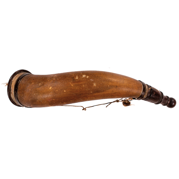 This Colonial era Engraved Powder Horn measures about 11” long. It has a turned spout stopper fully intact and its carved wooden end cap is complete. There is a rich original natural deep patina to the wood portions and the horn has pleasing rich yellowing tone. There are a number of period designs decorating the horn surfaces near the cap end. The spout stopper has the year 1763 hand-carved on one side and both the cap and spout have their original rounded and threaded plugs intact. The end cap has “Capt. Jonathan Bullus” inscribed into the wood which is topped horse hair. Two copper rings hold in place what appears to be its original catgut stringer. The consignor stated that Captain Bullus was known to George Washington. Further research is strongly recommended, as we could not locate a specific connection to Washington timely for the cataloging of this sale. Overall, whole and complete with an interesting nonstandard design and having honest wear.