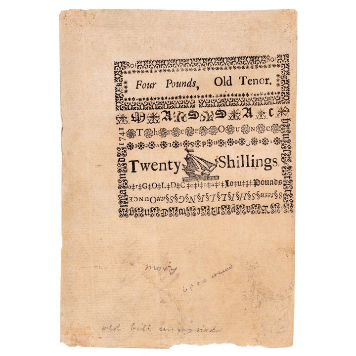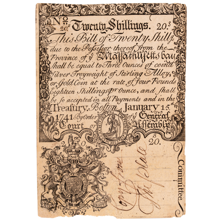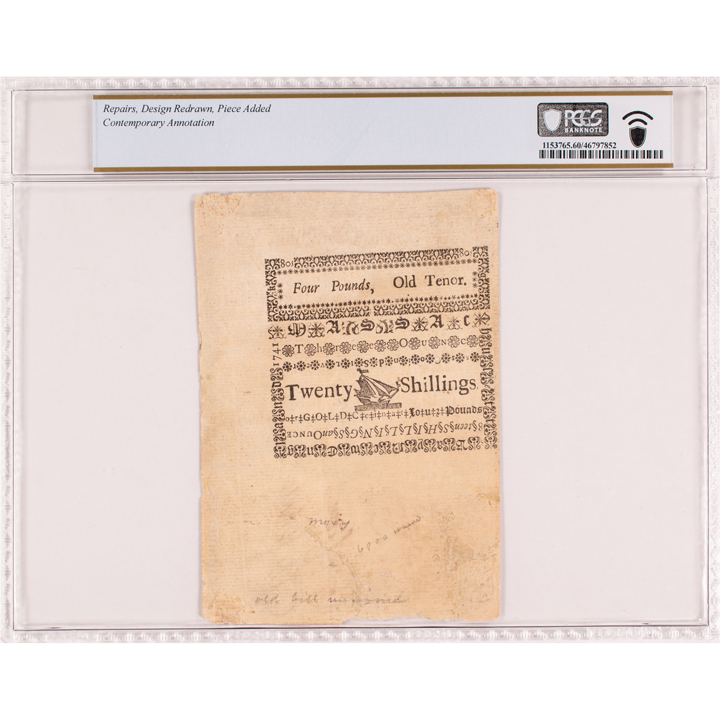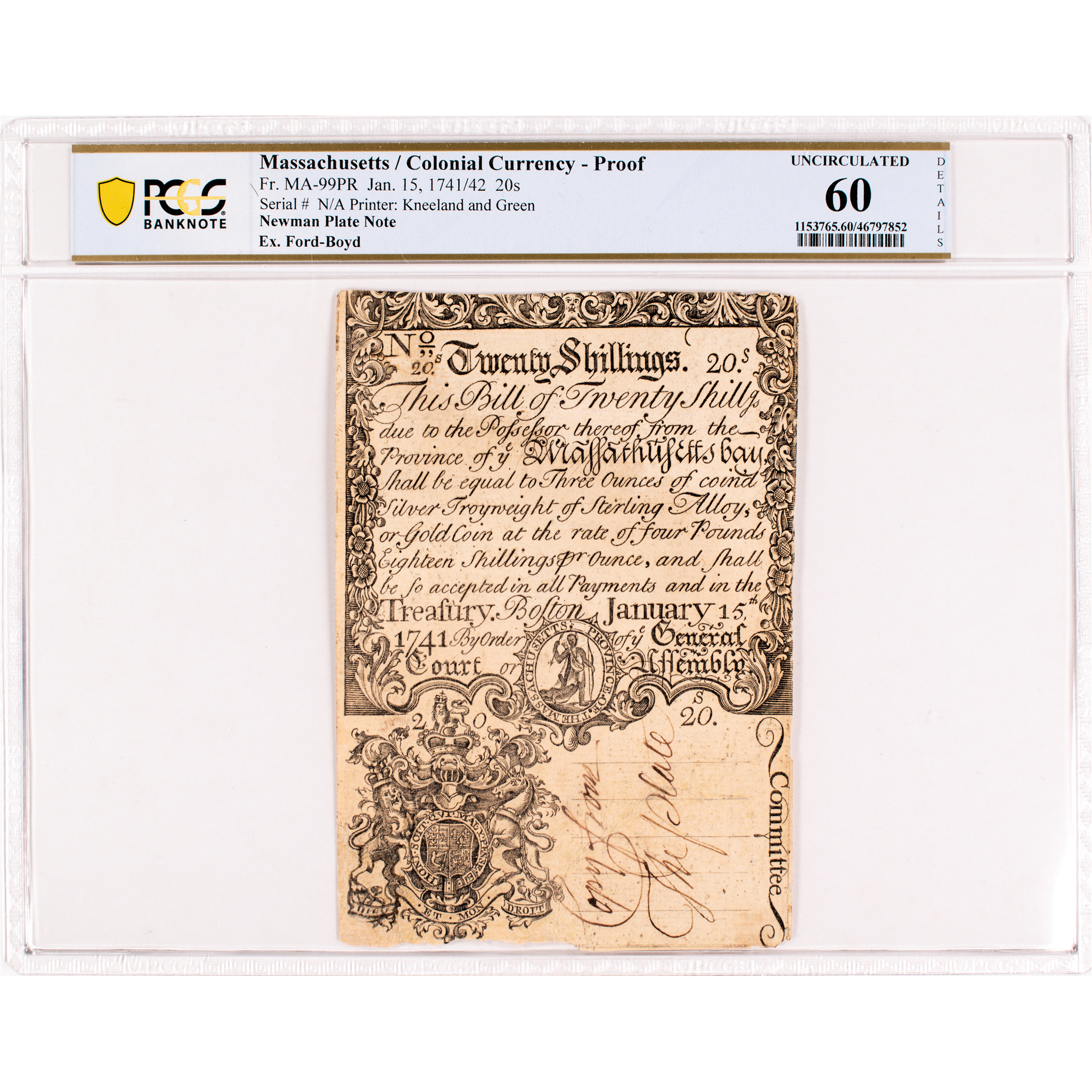 January 15, 1741/42, Province of ye Massachusetts Bay, Copper-Plate Engraved Unique PROOF, Twenty Shillings, New Tenor (or Four Pounds, Old Tenor), Unique, The Newman Plate Note, PCGS graded Uncirculated-60. Fr. MA-99PR. This unique Proof note is sharply printed on sturdy laid period paper printed from the engraved copper-plates by Kneeland and Green. As a Proof specimen there is no serial number or signatures, as intended. On the signature line written in clear brown ink it reads: “Copy from The Plate” (written vertically). This “Tall Note” measures 100mm x 140mm, printed on both sides. The face side is very well centered, the reverse more towards the right edge. This is a truly gorgeous note, exceptional for the era, despite PCGS qualifiers; repairs, design redrawn, piece added, contemporary notation. The bottom left corner at the Lion vignette, about 1” x .5” was restored and expertly conserved, otherwise this note is crisp and undeniably highly attractive. As written by cataloger Bruce Hagen in the 2004 Ford catalog, “Not issued, but a ‘Proof’ from the engraved face plate (so-called First Plate) and with the typeset back printed also... this striking certainly was done contemporary to the period and probably used for counterfeit detection.” The back has some old faint penciled collector notations reading: “old bill unsigned” / “6,000 issued” and “msxy” (which is Boyd’s cost code, indicating he paid $75 for this note likely circa 1910). This unique note represents the finest example of the issue extant. You likely do not have any example of this exceedingly rare issue. Prepare to bid as though you will never have another opportunity to acquire this lot. Pedigree Ex: F.C.C. Boyd Estate; Stack’s sale of the John J. Ford, Jr. Collection, May 2004, Lot 529. |
